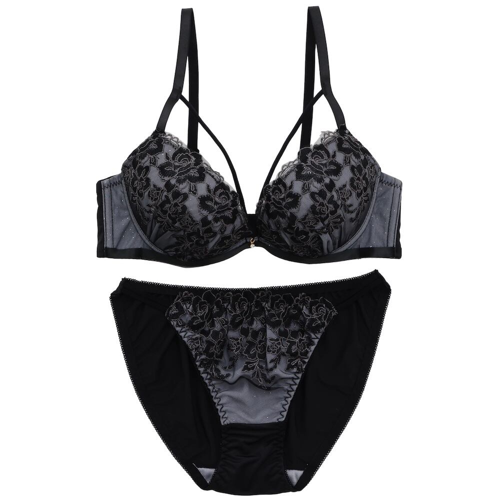 モノトーンカラーに胸元のマカロニコードがセクシーな雰囲気の大人上品なブラ&ショーツセットです。