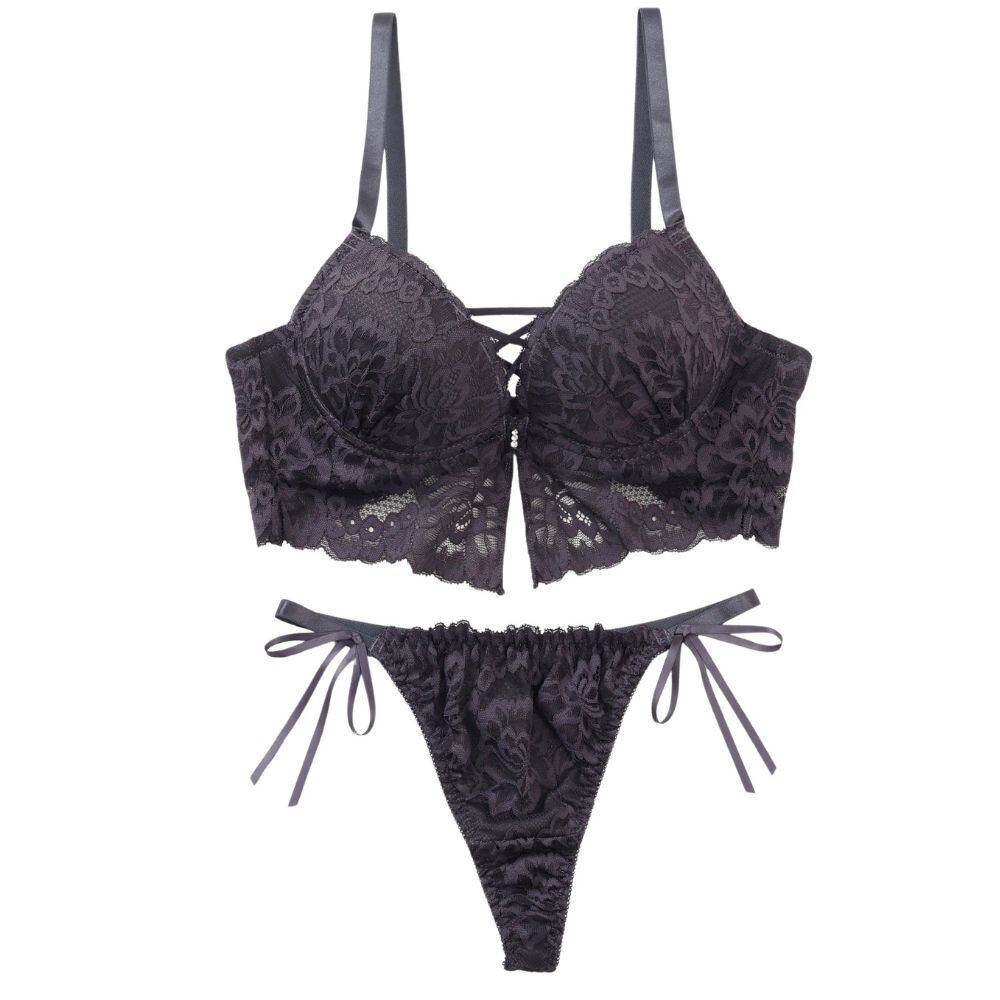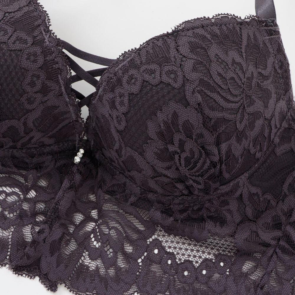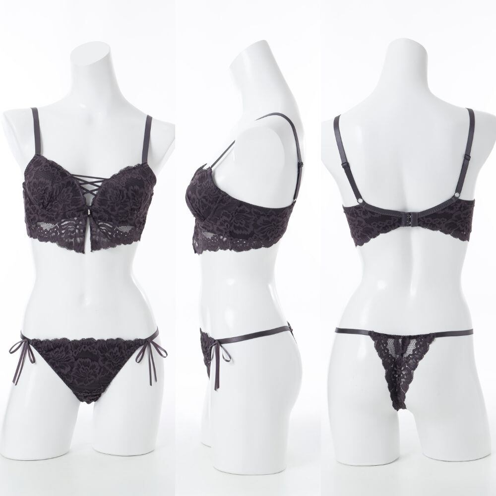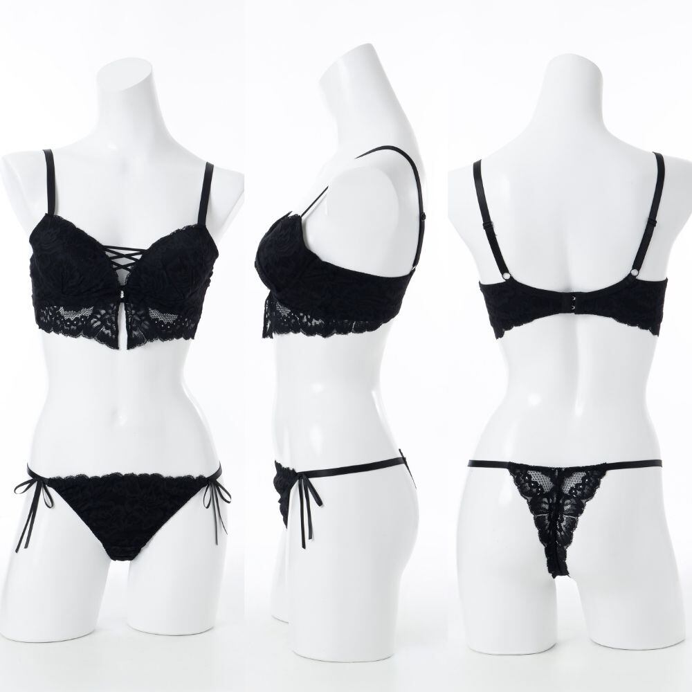 シンプルなモノトーンのレースに胸元にレースアップ風クロスコードをあしらった大人セクシーな一着です。