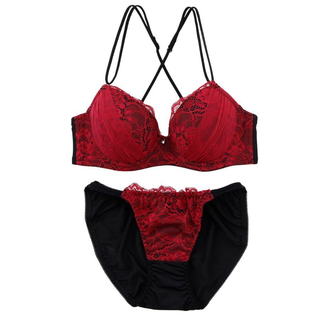 背中のクロスストラップが特徴的な大人セクシーなブラ&ショーツセットです。