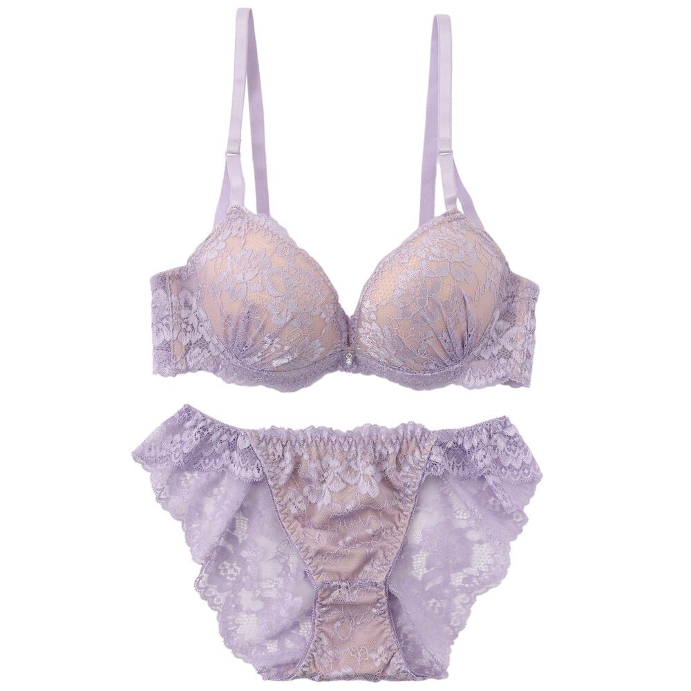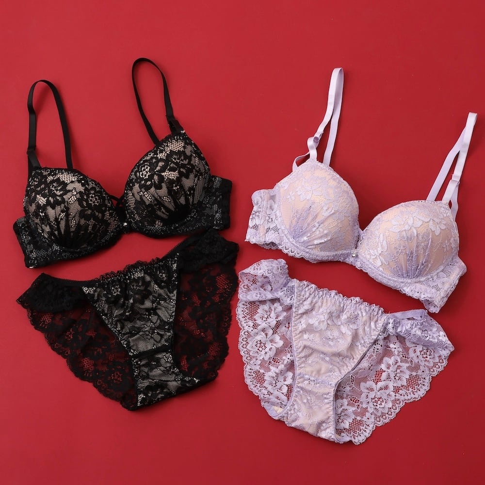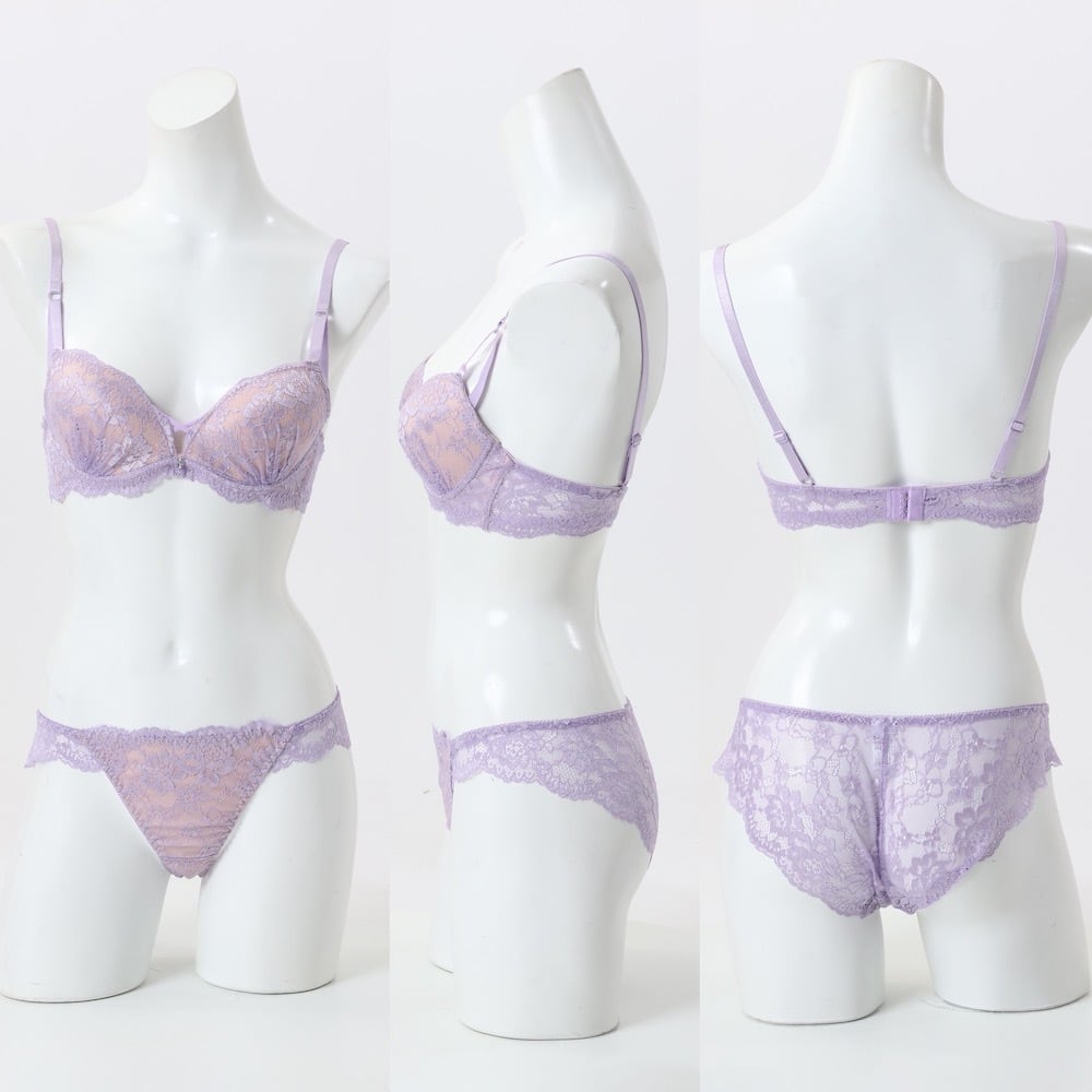 ヌードカラーに花柄の総レースをあわせた透け感がセクシーなブラとショーツの下着セットです。